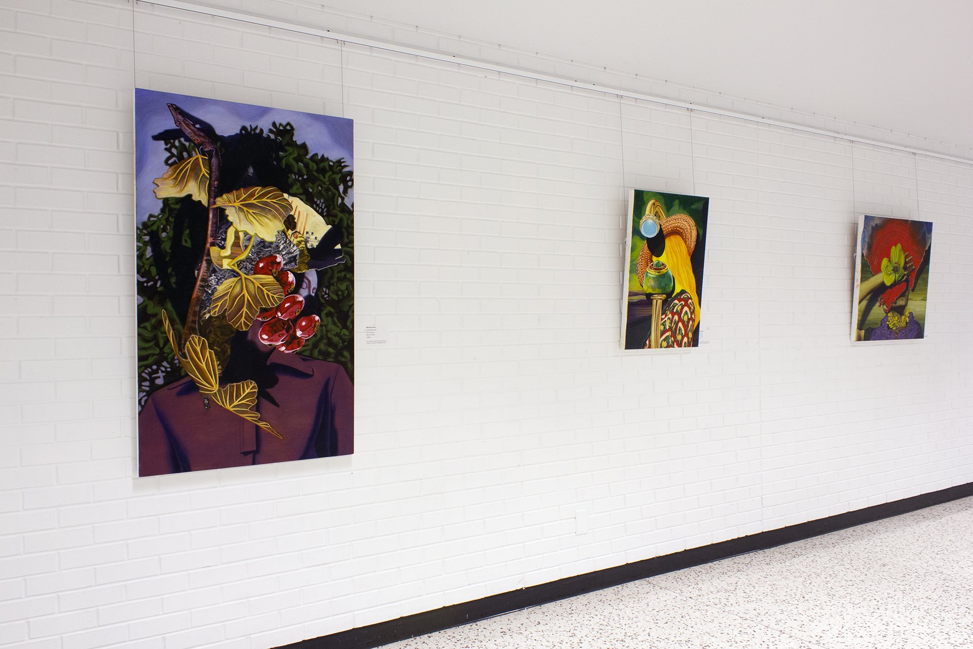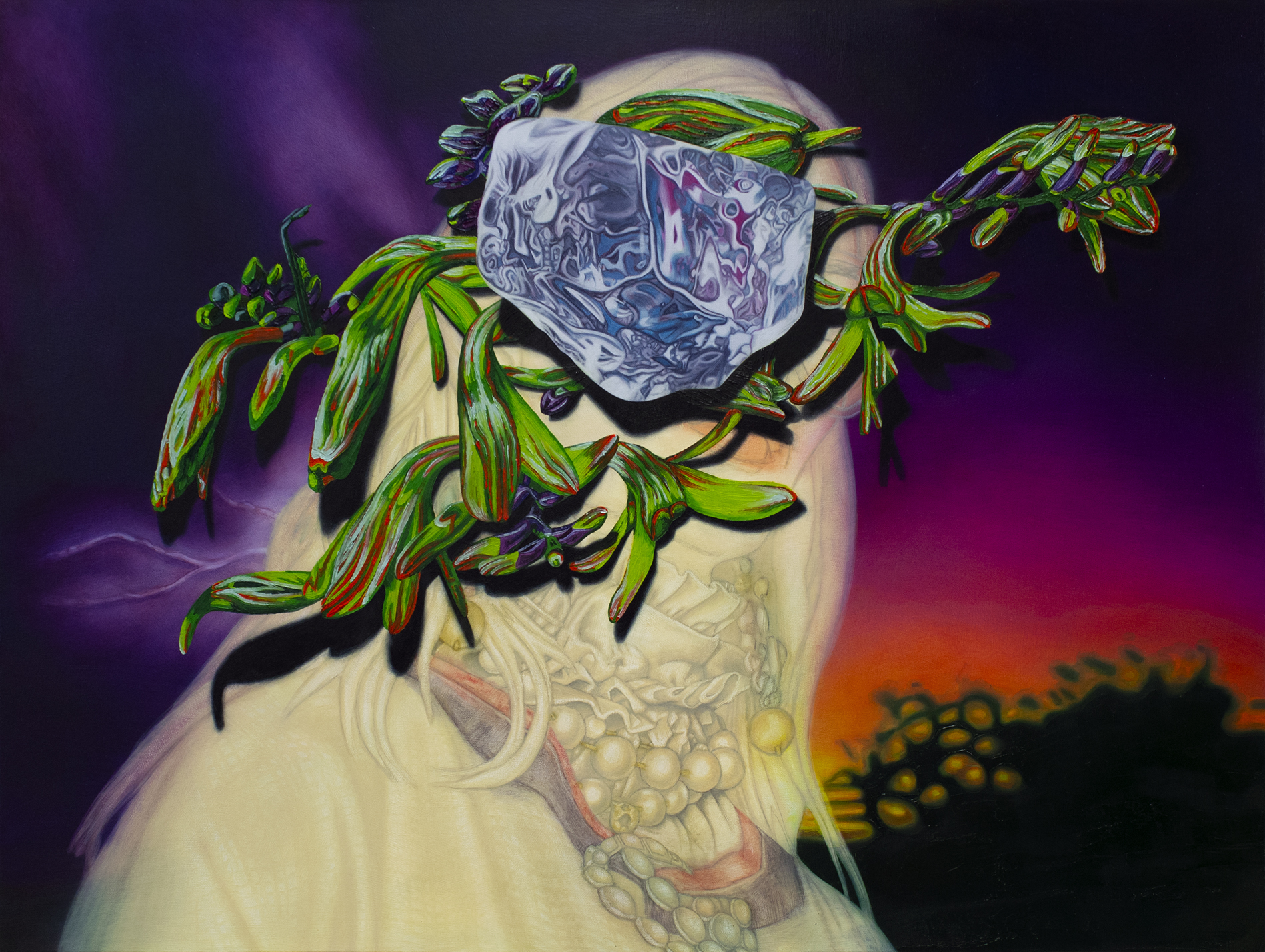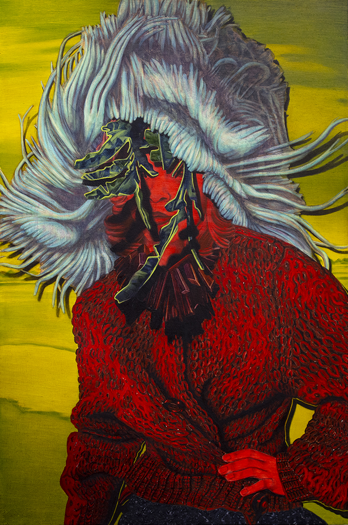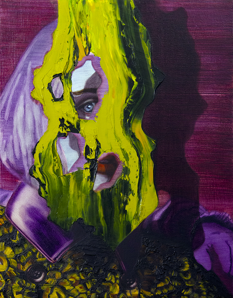 Influenced by, or in direct reference to fashion imagery, this series surrealistically explores the animate potential of accessories and decoration in relation to the female body. Ornament takes on an insidious purpose in these paintings, often consuming the figure and eclipsing its humanity. In my practice I aim to cultivate an aesthetic that is simultaneously seductive and unsettling as a means of investigating the overlap between desire, fantasy, identity, and self-image.
