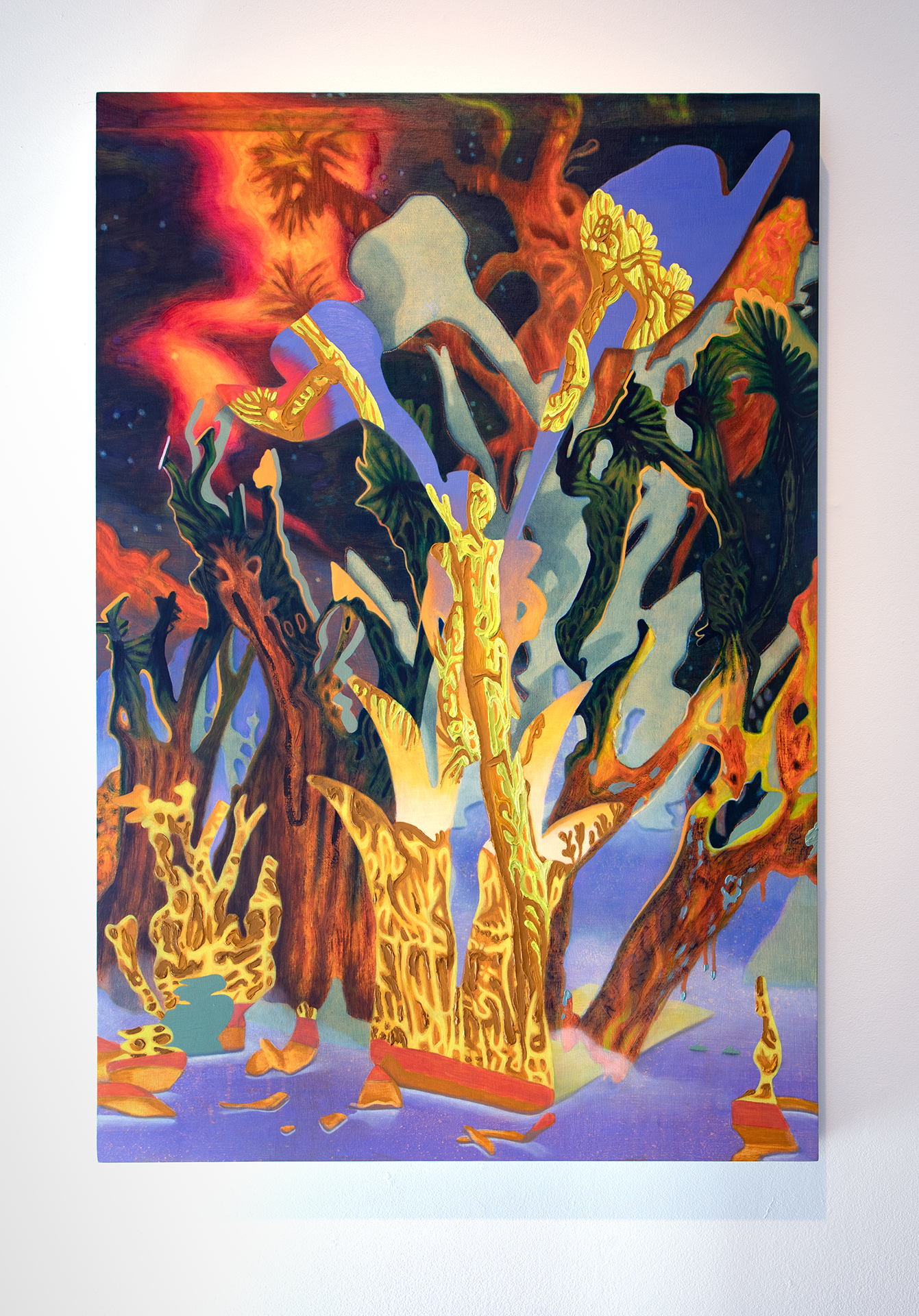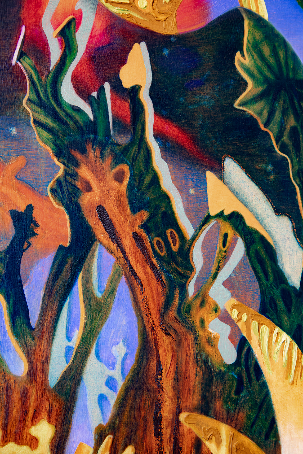 Tupperware trees spy for child eyes, 36″ x 24″, Acrylic and Oil on Wood Panel, 2025