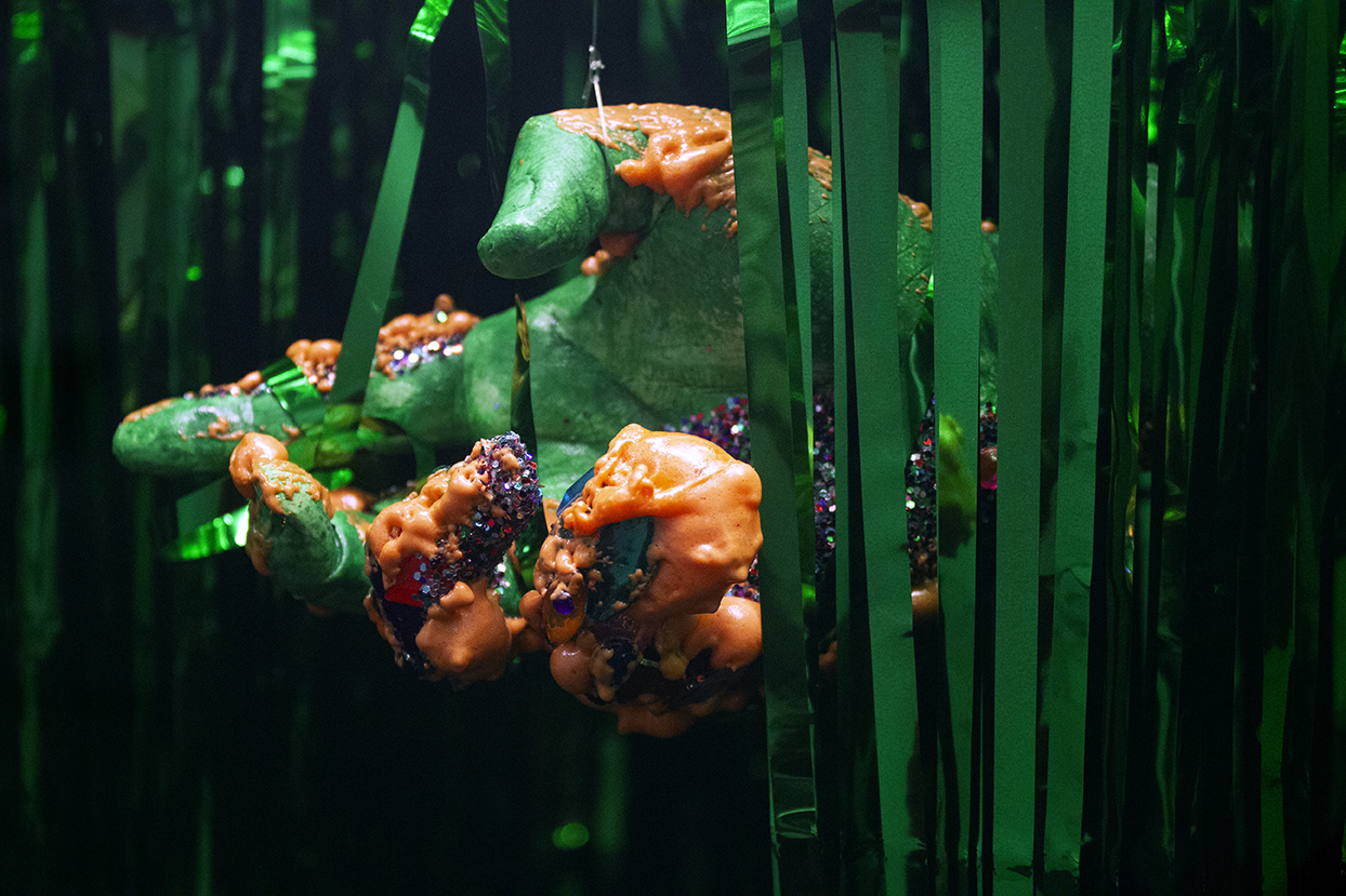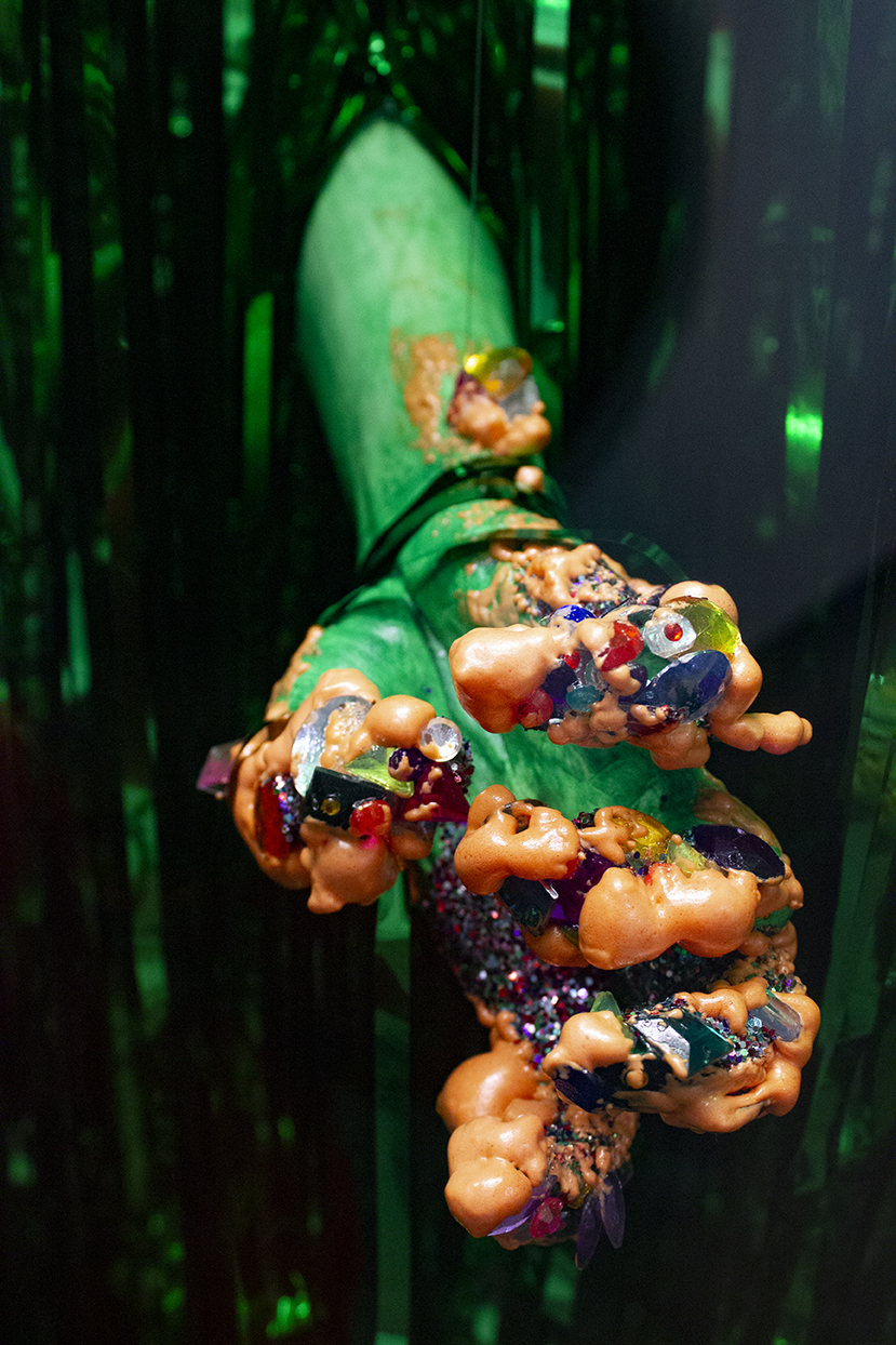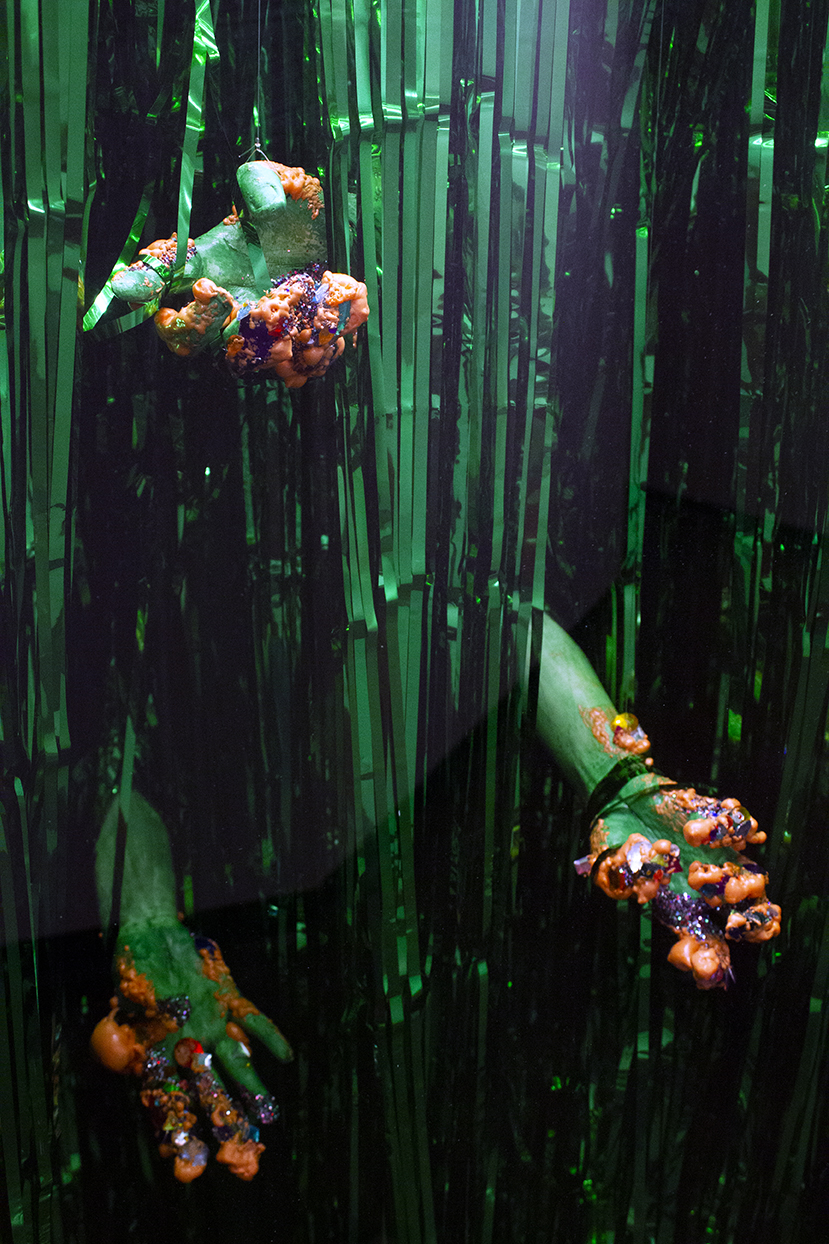 Bordering on the baroque, Beckon is an experimental foray into sculptural installation. It plays with our magpie-like attraction to bright, reflective objects, promising delights with outstretched, inviting gestures, but from disembodied hands disassociated from reality. These hands, reminiscent of mannequin models positioned in storefront windows, are slowly being consumed by accessories once meant to decorate them in a shrine-like ode to the power of the display. Beckon insists on seduction while highlighting the dangers of desire, utilizing the fragmented image of the disembodied hand as a means of creating a point of association as well as disconnect with the viewer. It simultaneously invites and threatens, beckons and repels, offers promise and yet leads nowhere.