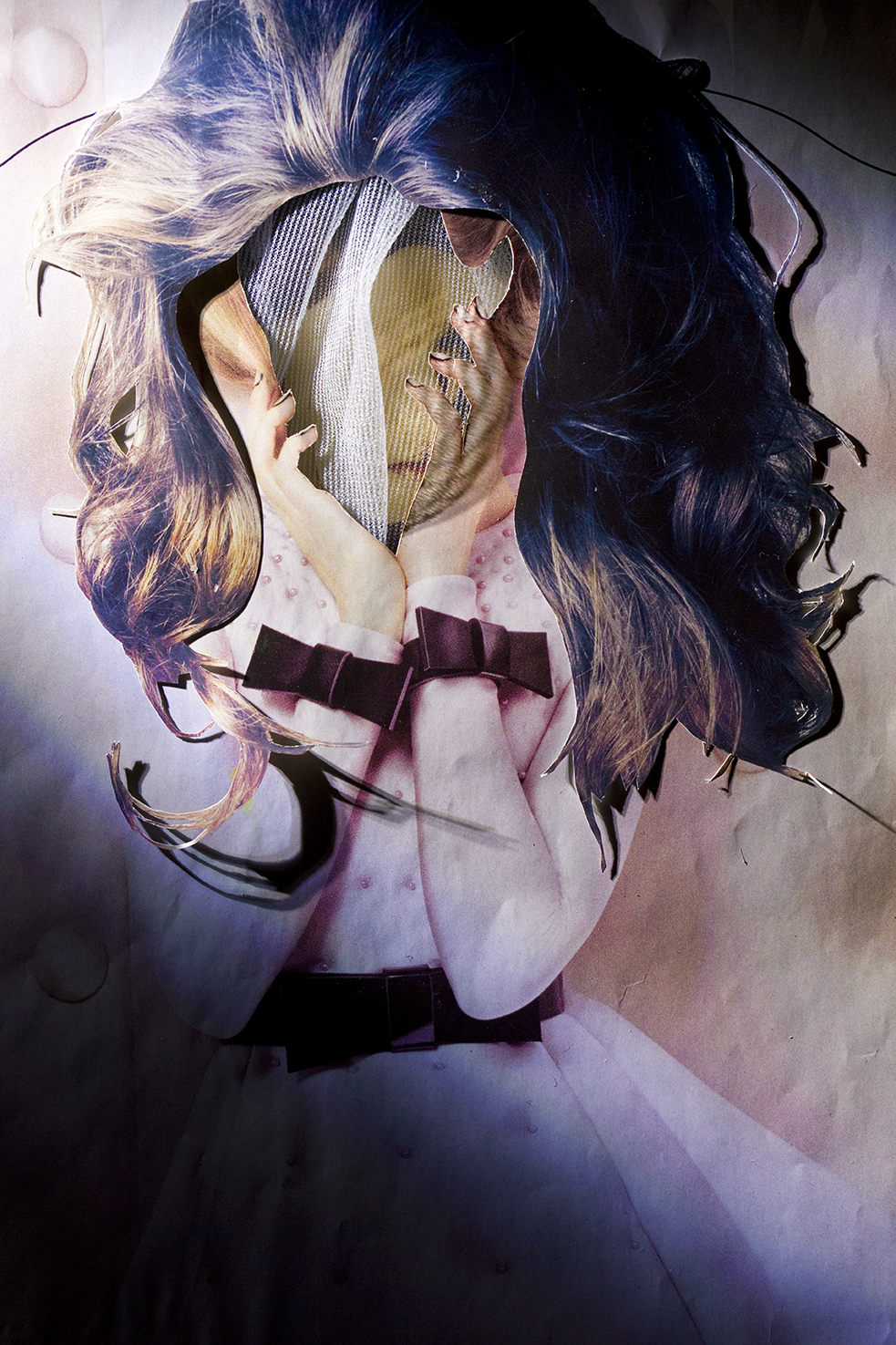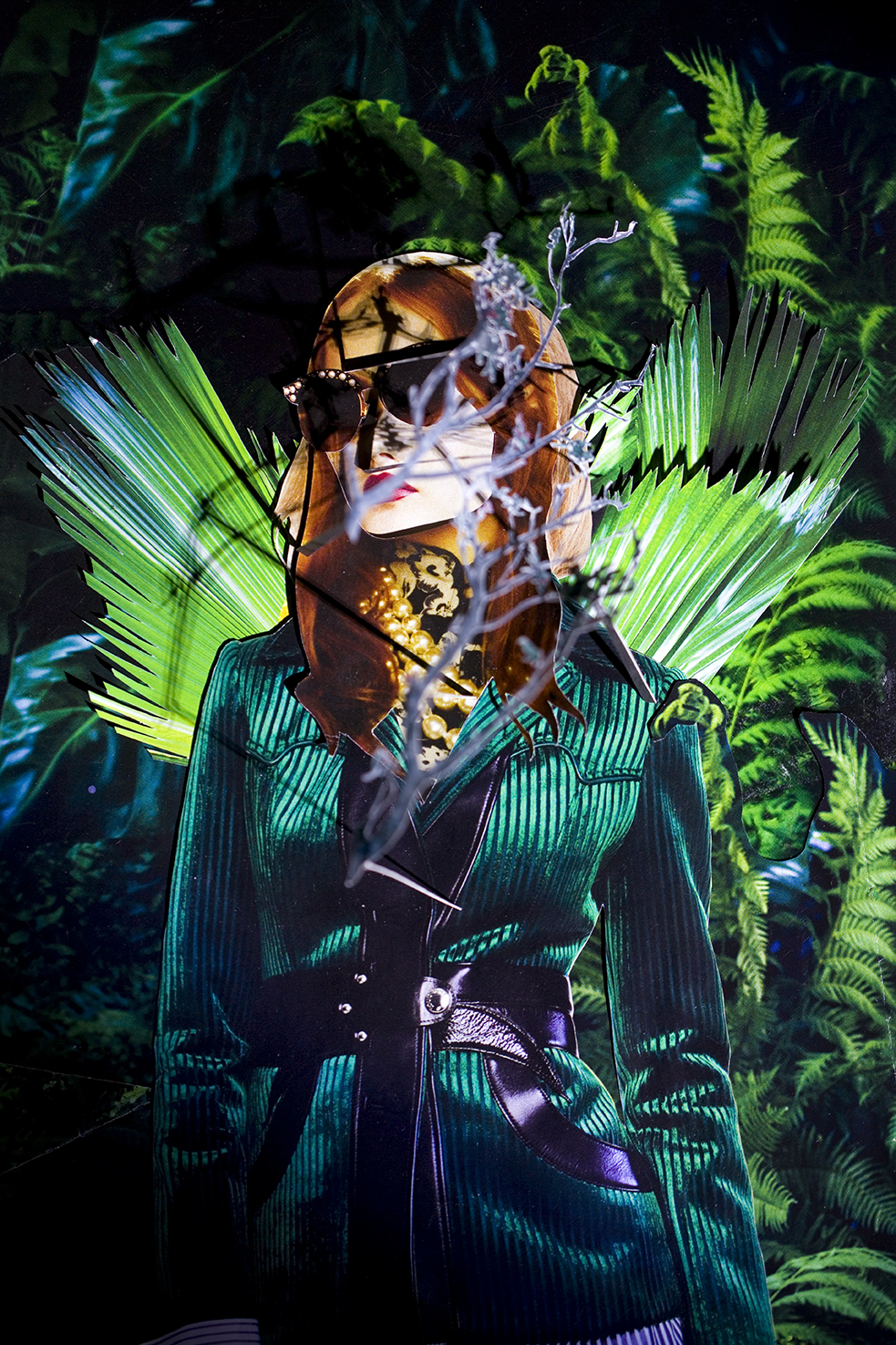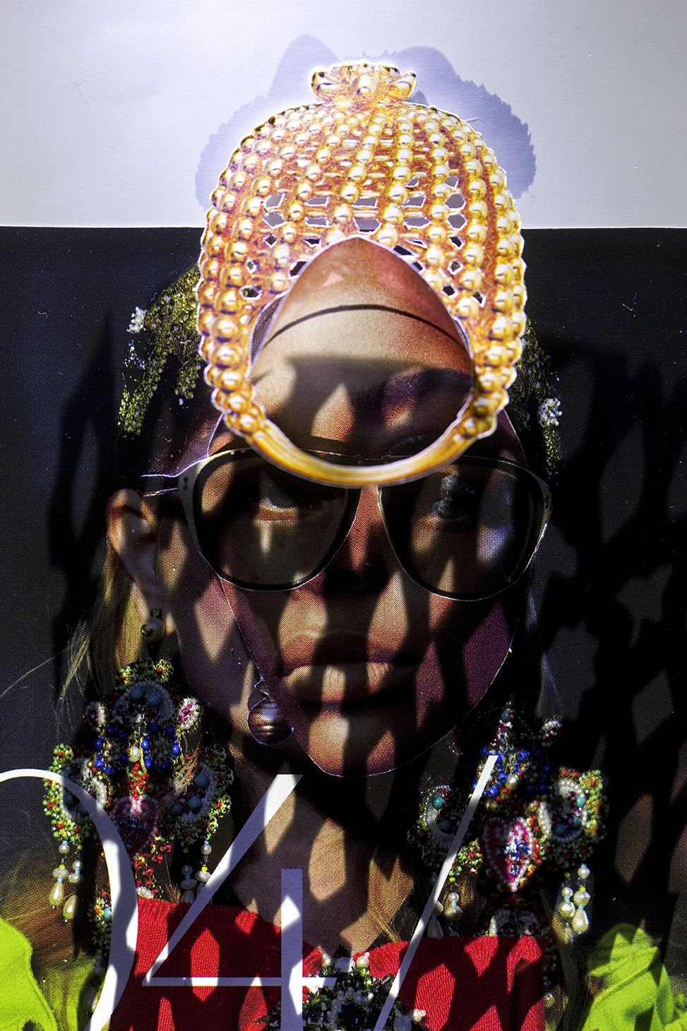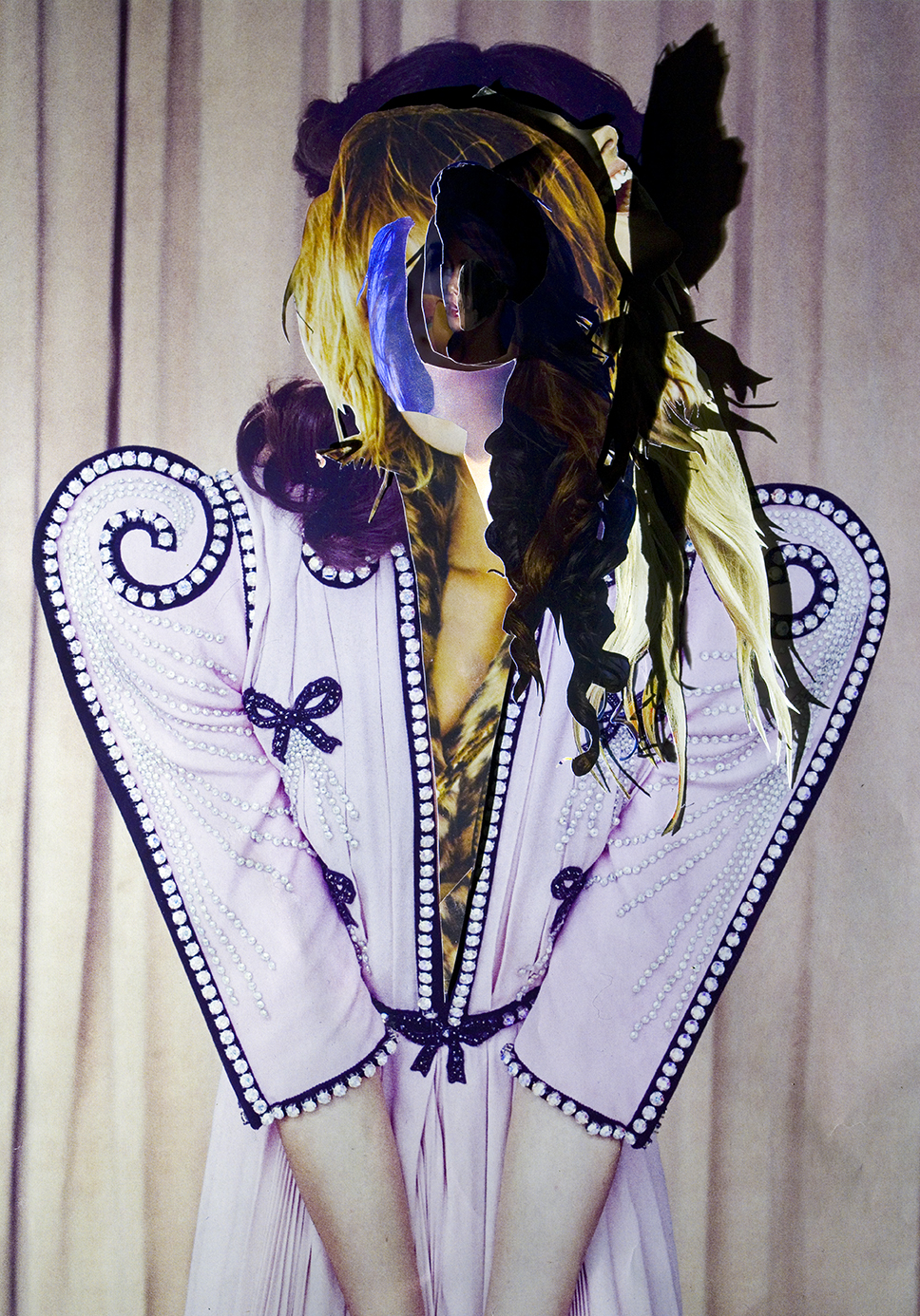 In my work I aim to cultivate an aesthetic that is simultaneously seductive and unsettling as a means of investigating the overlap between desire, fantasy, and self-image. Cut, extracted, layered and lit, these photographed assemblages present the female body as a sight of anxiety — one that concurrently functions as both self-made armor and a fractured hindrance. The figure has built a world for herself that is enchanting, yet pernicious to her survival, in which she disassociates from both herself and her environs. Decoration begins to take on an insidious purpose, often masking her figure, pushing the nature of her subject hood into a state of flux.