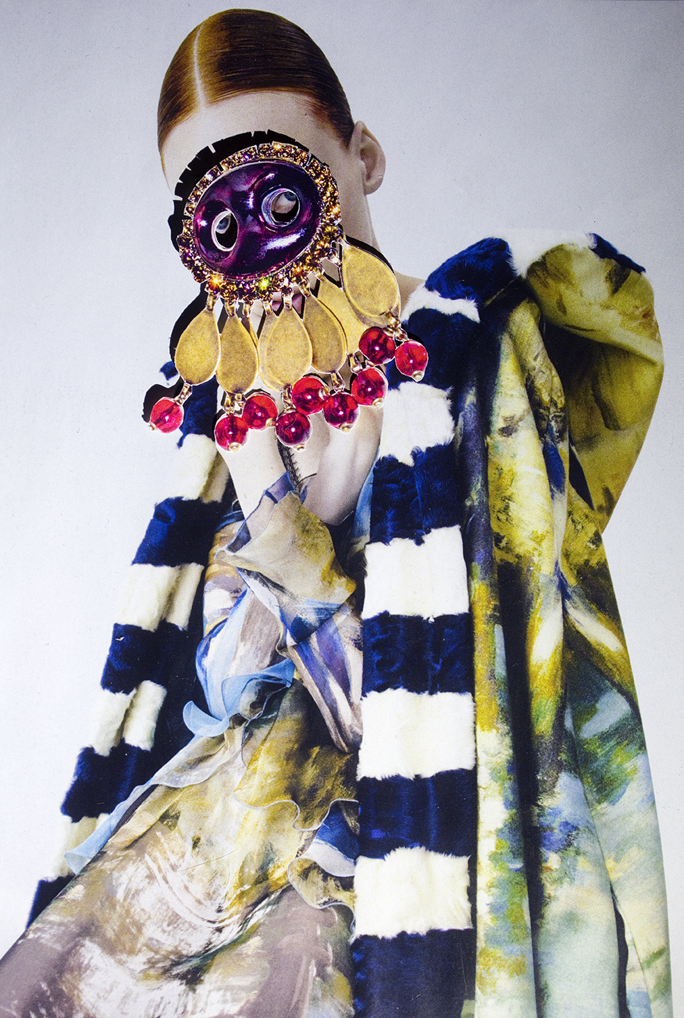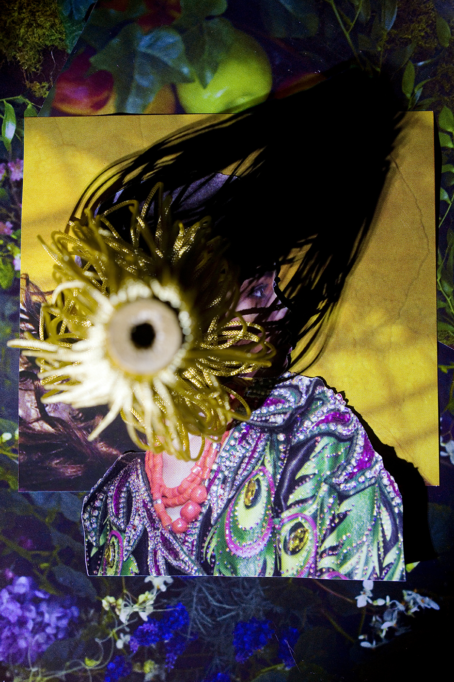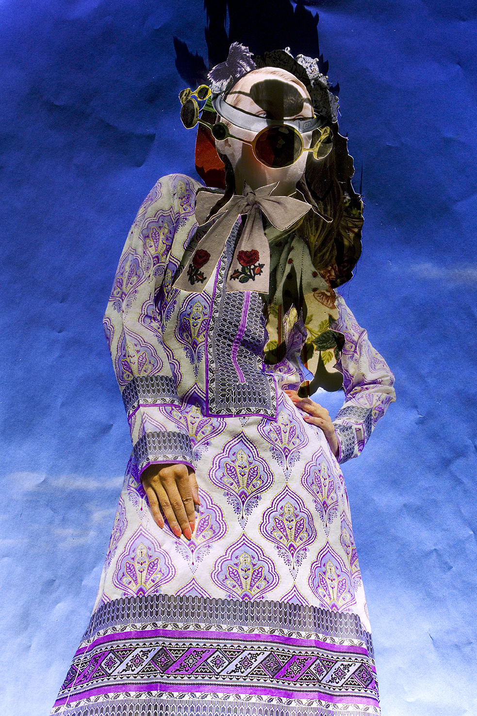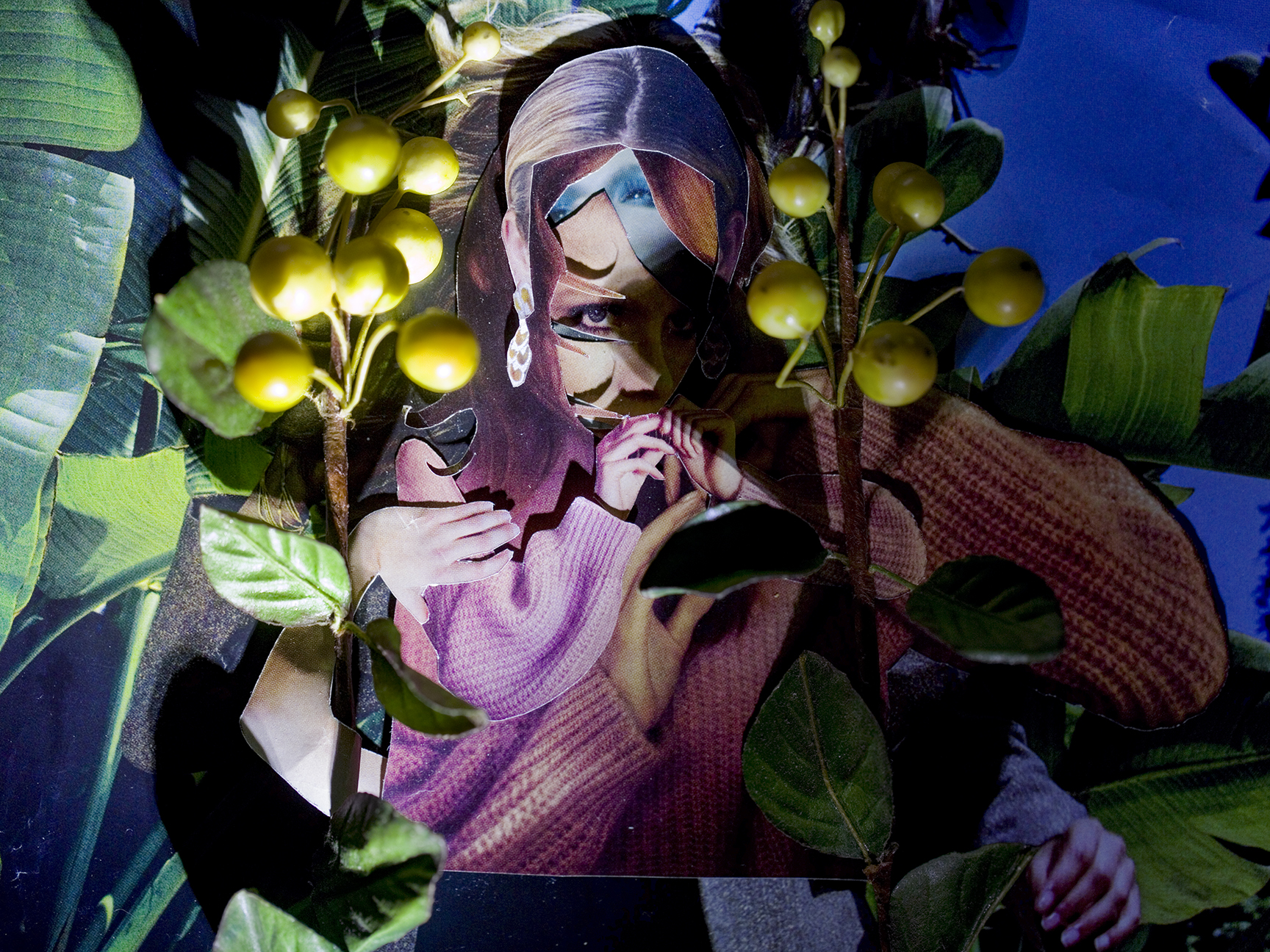 In my work I aim to cultivate an aesthetic that is simultaneously seductive and unsettling as a means of investigating the overlap between desire, fantasy, and self-image. Cut, extracted, layered and lit, these photographed assemblages present the female body as a sight of anxiety — one that concurrently functions as both self-made armor and a fractured hindrance. The figure has built a world for herself that is enchanting, yet pernicious to her survival, in which she disassociates from both herself and her environs. Decoration begins to take on an insidious purpose, often masking her figure, pushing the nature of her subject hood into a state of flux.